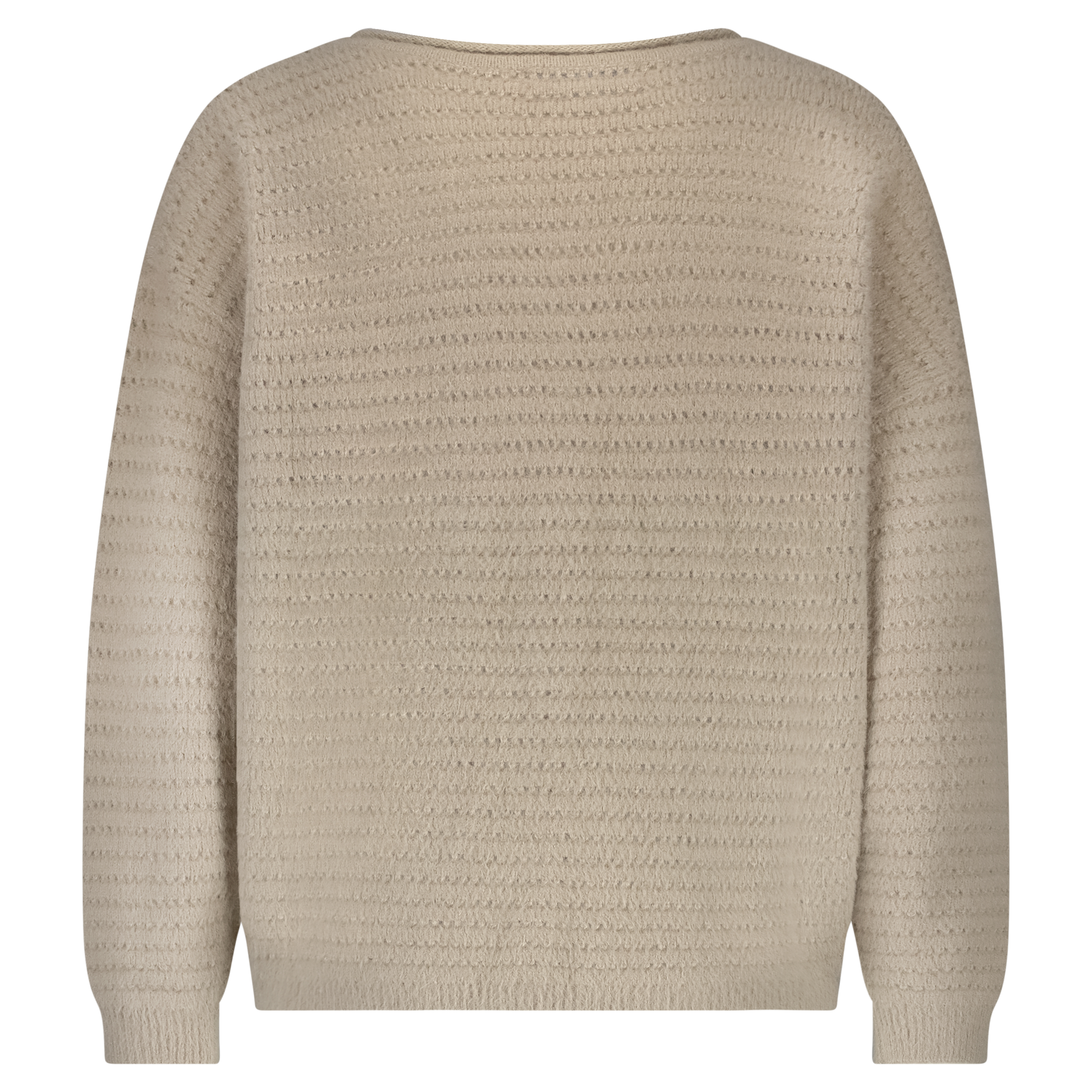 De Fluffy Ajour Sweater is een ajour gebreide zachte trui met een ronde hals en lange mouwen. De trui heeft een geribde boord aan de onderkant en bij de mouwen en is verkrijgbaar in de kleuren black, clay, warm taupe & white.